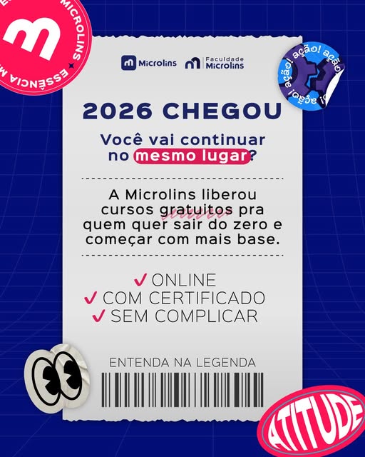 2026 chegou. Agora a pergunta é sincera: você vai continuar no mesmo lugar? 👀 Muita gente quer mudar, crescer, evoluir… mas trava porque não sabe por onde começar. Por isso a Microlins liberou cursos gratuitos pra quem quer sair do zero, ganhar base e fortalecer o currículo — sem pressão e sem gastar nada. ✔ Online ✔ Com certificado ✔ Pra quem quer começar de verdade 👉 Quer saber como funciona? É só clicar no link: https://microlins.com.br/cursos-gratis/?utm_source=feed_fb&utm_medium=social&utm_campaign=cursos-gratis Salva esse post pra lembrar: mudar de lugar não começa com mil passos. Começa com um.